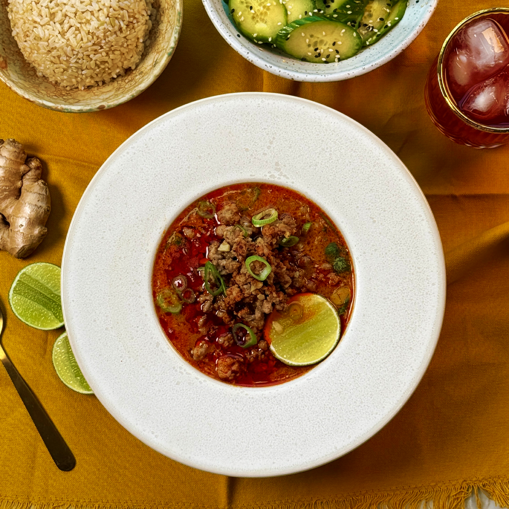 Ground pork brings natural comfort food flavor to this Thai-inspired soup that skips the dumpling folding but delivers all the satisfaction. Coconut curry broth and silky wonton wrappers make it feel special, but the 30-minute timeline keeps it real for weeknight cooking.