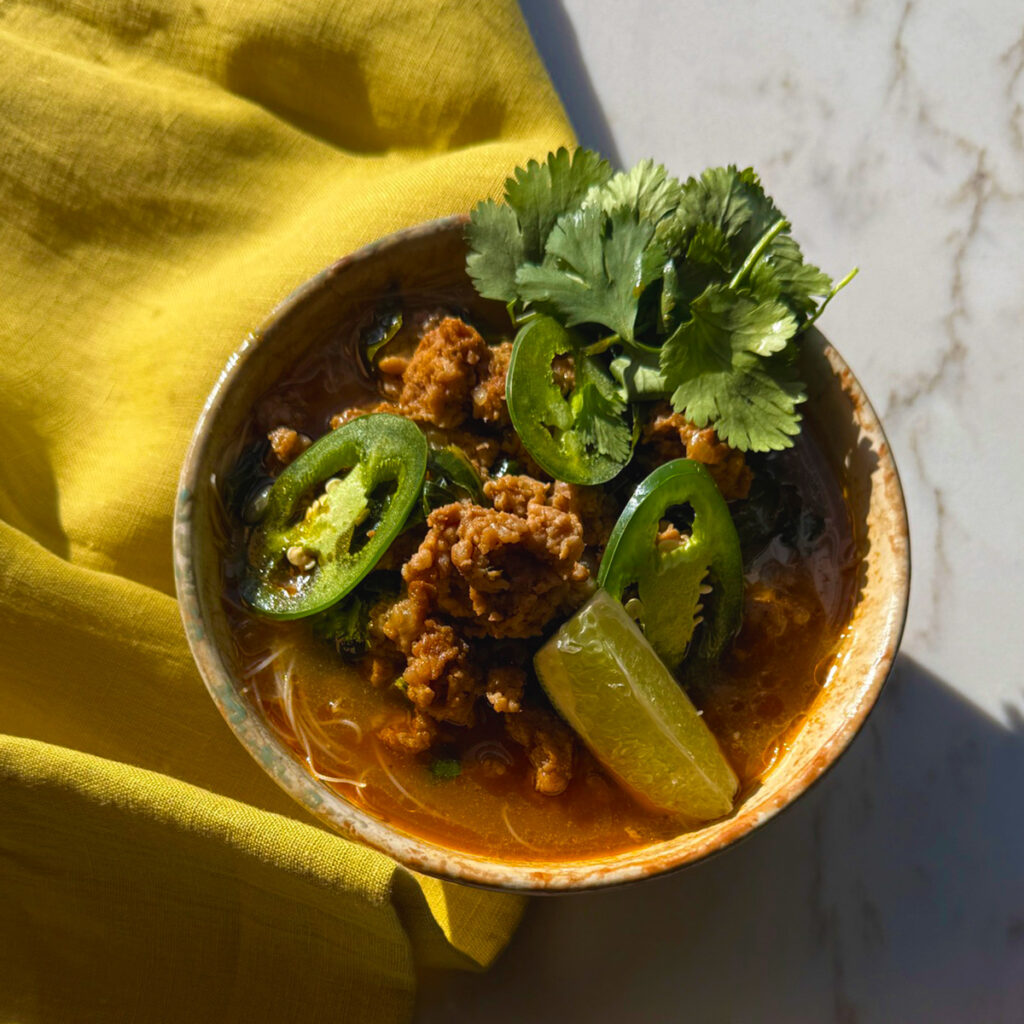 This cozy, flavor-packed bowl brings together savory ground pork, tender collard greens, and silky rice noodles in a rich, aromatic broth. This vibrant pho-inspired dish is comforting, hearty, and bursting with bold, satisfying flavor in every bite.