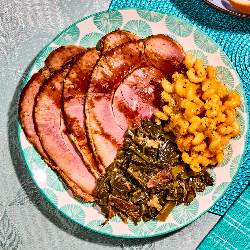 - 8–10 lb. pre cooked, spiral-cut ham (bone-in preferred)