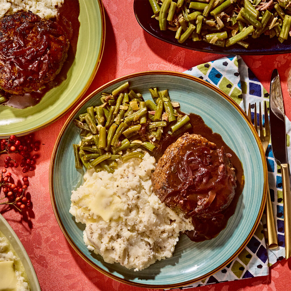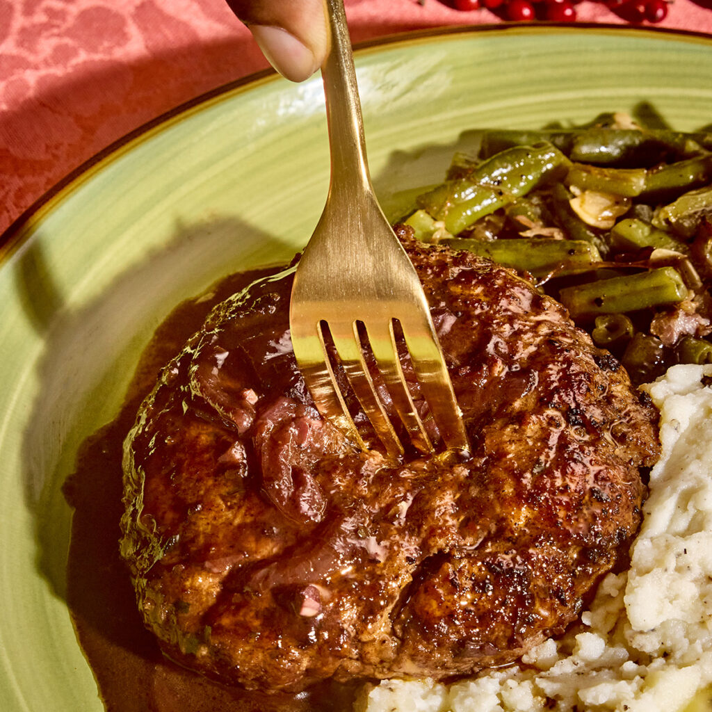 Red Wine & Onion Glazed Salisbury Ground Pork turns a comfort classic into a full flavor feast. Succulent ground pork covered in silky, rich red wine onion gravy brings deep, hearty flavor. It’s comfort food with main character energy.